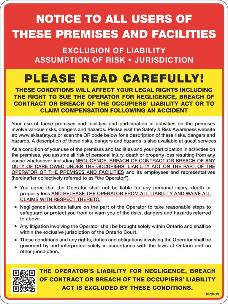 The use of ski area premises and facilities and participation in activities at ski areas involves various risks, dangers and hazards. It is a condition of your use of the premises and facilities and your participation in these activities that you assume all risk of personal injury, death or property loss resulting from any cause whatsoever, including negligence, breach of contract, breach of statutory duty of care, or breach of any other duty of care on the part of the ski area operator. Your legal responsibility as a user of the ski area premises and facilities or participant in activities at the ski area is explained in the following notice, which you will see posted at the ski area.