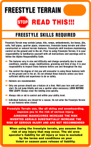 When using the Freestyle Terrain, you assume the risk of any injury that may occur. The ski area operator’s liability is excluded by the terms and conditions on your ticket or season pass release of liability.